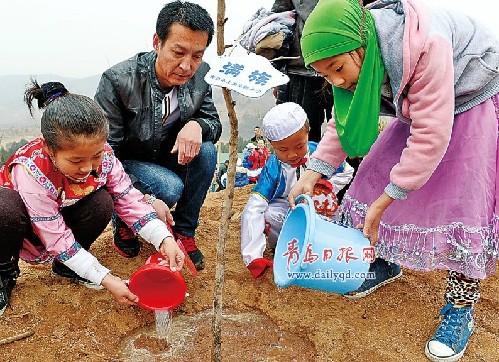 ▲昨天,上海支路小學(xué)的學(xué)生、老師及家長(zhǎng)共500余人來(lái)到嶗山百雀林一起參加植樹活動(dòng)。針對(duì)學(xué)校少數(shù)民族學(xué)生較多的特點(diǎn),他們共建了一片民族和諧林,大家還在樹上掛上夢(mèng)想卡。王 群 攝