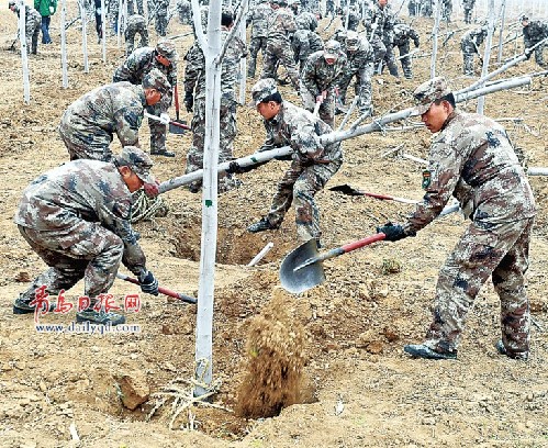 昨天,駐青部隊(duì)官兵揮鍬上陣在小澗西生態(tài)間隔林場(chǎng)栽種下了白蠟、松樹等數(shù)千棵樹。傅學(xué)軍 攝