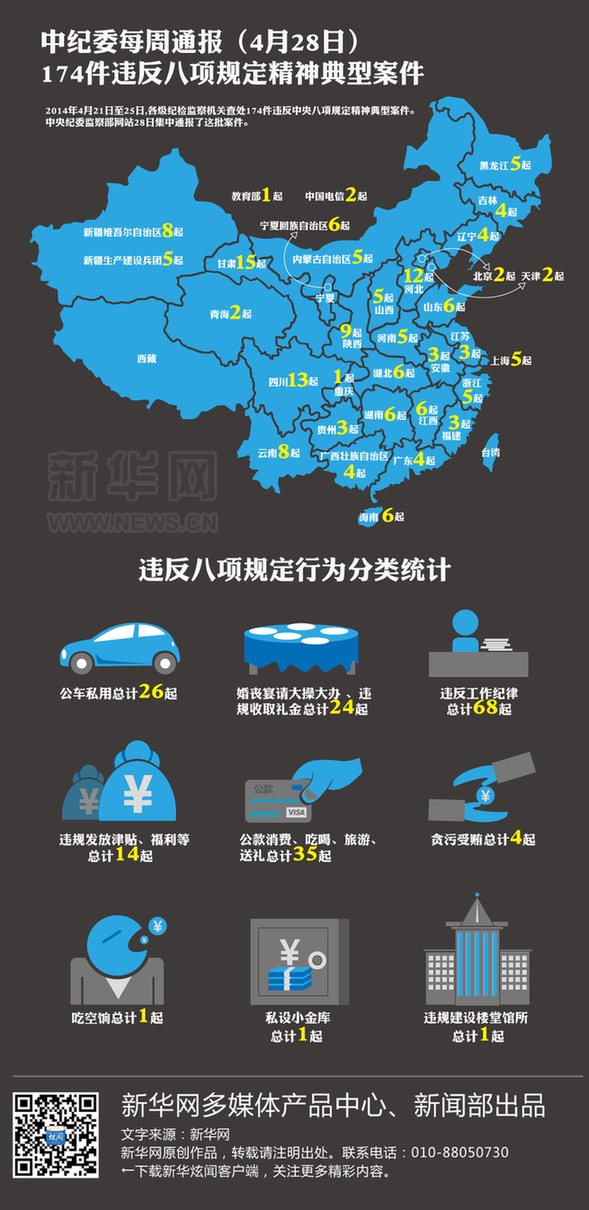 ????2014年4月21日至25日,各級(jí)紀(jì)檢監(jiān)察機(jī)關(guān)查處174件違反中央八項(xiàng)規(guī)定精神典型案件。中央紀(jì)委監(jiān)察部網(wǎng)站28日集中通報(bào)了這批案件。(制圖:張楨)