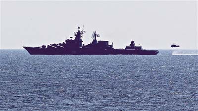 ????聯(lián)合護(hù)航演練,水面艦艇編隊(duì)在俄方“瓦良格”號導(dǎo)彈巡洋艦指揮下與被護(hù)船舶組成聯(lián)合護(hù)航隊(duì)形,雙方艦載直升機(jī)升空巡邏警戒,對高速接近護(hù)航編隊(duì)的2艘“海盜船”實(shí)施攔截驅(qū)離。