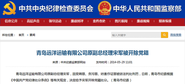 ????青島遠(yuǎn)洋運(yùn)輸有限公司原副總經(jīng)理宋軍,因受賄罪、貪污罪、妨害作證罪被依法判處刑罰,日前,青島市紀(jì)委根據(jù)《中國(guó)共產(chǎn)黨紀(jì)律處分條例》等有關(guān)規(guī)定,決定給予宋軍開(kāi)除黨籍處分。(青島市紀(jì)委)
