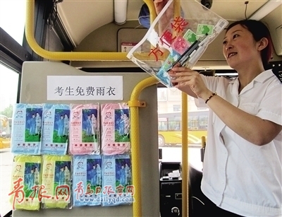 ■昨天,青島公交巴士公司的工作人員在212路三部高考專線車上安放雨衣和“百寶囊”。臨近高考,他們對(duì)三部專線車進(jìn)行了系統(tǒng)檢查和消毒,并在車前掛上了大紅花,安裝上“高考專線車”標(biāo)識(shí)牌,挑選了三名技術(shù)好、駕齡在20年以上的駕駛員掌舵“高考專線車”。