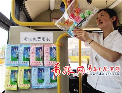 ??? 5日,青島公交巴士公司的工作人員在212路三部高考專線車上安放雨衣和“百寶囊”。臨近高考,他們對三部專線車進(jìn)行了系統(tǒng)檢查和消毒,并在車前掛上了大紅花,安裝上“高考專線車”標(biāo)識牌,挑選了三名技術(shù)好、駕齡在20年以上的駕駛員掌舵“高考專線車”。傅學(xué)軍 攝