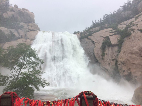 大雨過后,嶗山八水河龍?zhí)镀偎看笤?。奔流的山泉?0米高、10余米寬的絕壁懸空倒瀉,雪玉飛揚,猶如玉龍飛舞,讓人嘆為觀止。瀑布分為兩大股,落下十幾米后,又與嶙峋山石相擊,分成數(shù)股細(xì)流躍入潭中,更如條條幼龍,圍在兩條大龍身側(cè)嬉戲,玉珠飛濺,水霧彌漫,走至近處,只覺水霧撲面而來,如入雨中,而身側(cè)不遠(yuǎn)卻是陽光燦然,令人如入仙境。瀑下有潭,上有雪浪,底如碧玉,清澈見底。此即為嶗山十二勝景之一的“龍?zhí)秶娪辍?。周至元有詩贊曰:“凌空亂濺沫,疑是玉龍飛。白掛虹千仞,青山環(huán)一圍。拋來珠落落,舞處雪霏霏。游客貪清賞,斜陽不忍歸?!?/p>