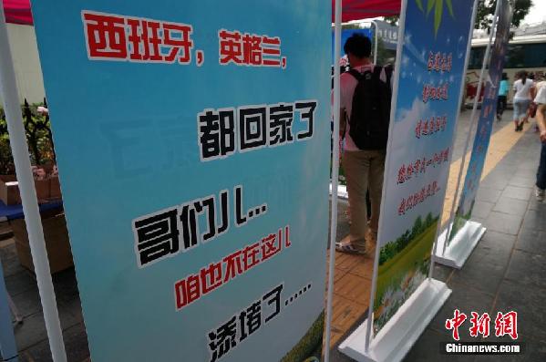 “西班牙、英格蘭都回家了,哥們兒,咱也不在這兒添堵了”、“嘿,哥們兒,收攤兒回家看世界杯吧!”……7月3日,鄭州市紫荊山立交橋下,多幅寫著另類標(biāo)語的藍(lán)色宣傳架,吸引了許多過往市民觀讀。鄭州市金水區(qū)執(zhí)法局工作人員稱,這些宣傳架會選擇擺放在占道經(jīng)營的攤位前方,以此舉勸說商戶轉(zhuǎn)移攤位,合規(guī)經(jīng)營。不少市民認(rèn)為,商販違規(guī)占道經(jīng)營著實不妥,城管人員治理占道經(jīng)營,連網(wǎng)絡(luò)萌語都用上了,著實不易。周小云攝