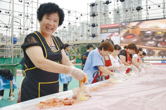 ????7月19日,由10余名韓國大廚親手拌制的近千斤拌飯,讓中韓兩國2014位市民唇齒留香。7月21日的韓式拌辣白菜,更是贏得市民的廣泛青睞。當(dāng)日10時,記者趕赴主會場時,三、四百名手持免費(fèi)票的市民排起了長蛇隊(duì),有的大媽還拿來了塑料盆。