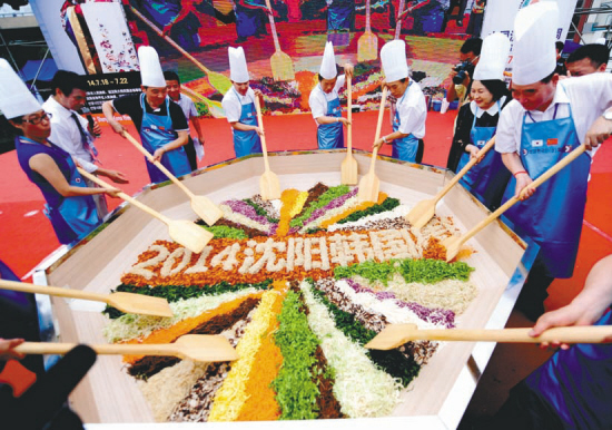 ????廣西玉林來沈陽旅游的李江夫婦帶著小孫子也來到了拌菜現(xiàn)場,爺孫倆忙著拍照,阿姨一邊拌菜一邊笑著說:幾天前來沈陽,看到《沈陽日報》上有韓國周拌菜活動的宣傳就沒走,我們真有福氣啊。比想象的好多了,原以為就熱鬧一下,幾十人參與,現(xiàn)在看來三百人都擋不住啊!