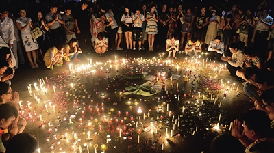 ■上圖:8月2日晚,昆山市民在昆山市民廣場(chǎng)哀悼死者、為生者祈福。新華社照片