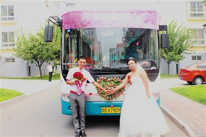 ????“從公交巴士開到家門口開始,很多親戚和朋友都特別好奇,一直在問我,都覺得這是個好點子。 ”婚禮剛剛開始,楊維方就說起了婚車的由來。原來兩人是經朋友介紹認識,楊維方是部隊轉業(yè)軍人,妻子劉艷則是青島交運膠州溫馨巴士有限公司的員工。隨著兩人的感情越來越好,去年開始談到了結婚。和所有的新人一樣,楊維方想給妻子籌辦一個意義非凡、終生難忘的婚禮。春節(jié)期間,劉艷提議,不如不要浪費錢雇豪華的婚車車隊了,既沒新鮮感也有點俗套,還不如請新能源溫馨巴士做婚車。楊維方和家人商量后,便決定用公交巴士當一回婚車。經過協(xié)商后,青島交運膠州溫馨巴士有限公司決定派出4輛車當婚車?!昂唵尾贾昧艘幌拢杏X這樣的婚車很有意義,4輛車花了一千多元,這比其他的婚車隊伍至少便宜了2000元。 ”楊維方說。
