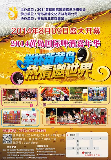 2014黃島國際啤酒嘉年華由2014黃島國際啤酒嘉年華組委會主辦、青島德坤文化旅游有限公司承辦、青島報業(yè)傳媒集團和青島金沙灘希爾頓酒店協(xié)辦,將于2014年8月9日至8月24日,在黃島金沙灘萬人演繹廣場隆重啟幕。