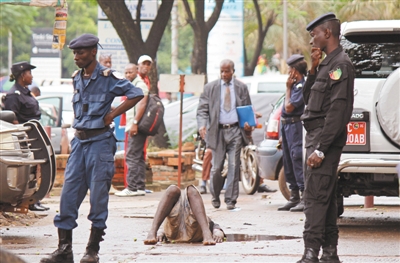 8月6日,幾內(nèi)亞科納克里,警察在一名男子附近守衛(wèi),該男子倒在水坑中,附近民眾因害怕該男子患埃博拉病毒而不敢靠近。