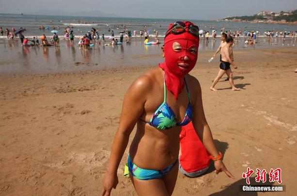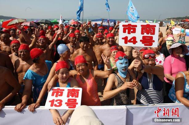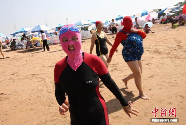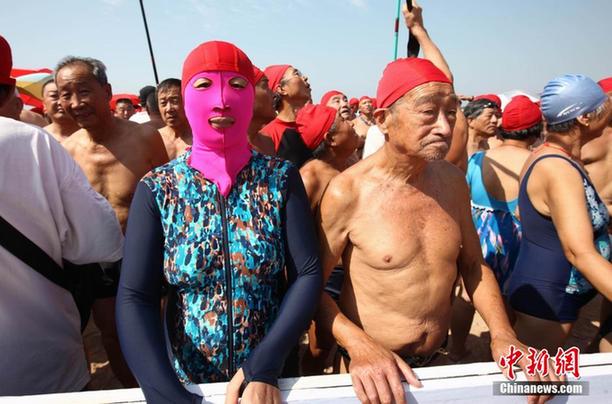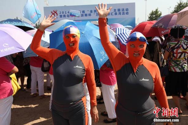 8月8日上午,在青島第一海水浴場,青島“臉基尼”大媽現(xiàn)身“全民健身日”主題活動(dòng)啟動(dòng)儀式暨萬人暢游匯泉灣活動(dòng)現(xiàn)場。這種女超人裝束,既防曬又防海蜇,深受中老年女泳者喜愛,成為青島海邊一道奇特的風(fēng)景,曾爆紅網(wǎng)絡(luò)。中新社發(fā) 徐崇德 攝