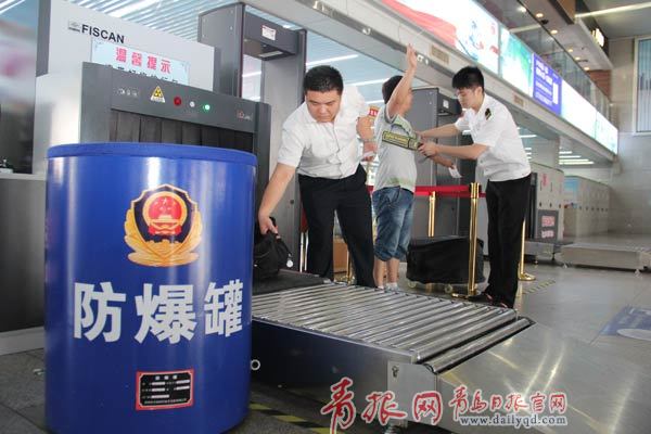 在交運(yùn)青島長(zhǎng)途汽車站乘客通過(guò)安檢門后安檢人員用手持安檢儀進(jìn)行二次安檢