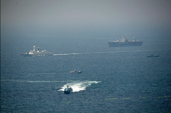 藍(lán)嶺艦艦員在艦上觀看中國(guó)海軍054A護(hù)衛(wèi)艦