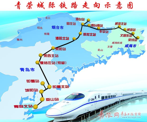 ????青榮城際鐵路是山東省內(nèi)第一條區(qū)域性城際高速鐵路,是構(gòu)建半島城市群間重要的快捷鐵路運(yùn)輸通道。該鐵路自青島市起,經(jīng)煙臺(tái)市,抵達(dá)威海市的榮成市,全長(zhǎng)299公里。全線共設(shè)城陽(yáng)、即墨北、萊西北、萊陽(yáng)、海陽(yáng)北、桃村北、官莊、煙臺(tái)南、牟平、威海北、威海、文登東、榮成等13個(gè)車站,設(shè)計(jì)時(shí)速250公里。