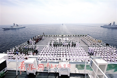 圖二:海軍在威海劉公島海域舉行甲午戰(zhàn)爭120周年海上祭奠儀式。新華社照片