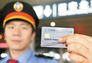 圖為西安北站工作人員展示“中鐵銀通卡”