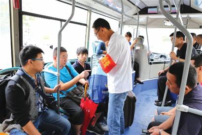 ????“這位乘客您好,麻煩打開包讓我們看看您有沒有帶危險(xiǎn)物品吧。 ”9月16日上午8:00左右,在交運(yùn)溫馨巴士隧道3路公交車車前門處的座位上多了兩名帶紅袖標(biāo)的監(jiān)督員。這是義務(wù)監(jiān)督員王國華和趙永明上崗的第一天,每到一站看到有攜帶行李較多的乘客上車,兩人就會主動請乘客進(jìn)行乘車檢查。9月16日早晨,當(dāng)有位乘客帶著淺黃色液體乘車時,王國華還會請攜帶者試喝,來保證車廂內(nèi)的安全。