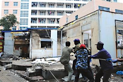 ????8月26日《青島晚報》曾經(jīng)報道過寧德路上一處用苯板建起的飯店起火,幸虧消防人員撲救及時,才未造成人員傷亡。火災(zāi)發(fā)生后,嶗山城管執(zhí)法人員對著火飯店附近區(qū)域存在安全隱患的苯板房進(jìn)行了調(diào)查摸底。9月18日,嶗山城管出動執(zhí)法人員10余名,對寧德路北側(cè)存在安全隱患較大的150平方米苯板材料房屋進(jìn)行先期拆除。