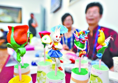 24日,記者在球員休息室見到面塑家高志和,在他的展臺前,插著10余個玫瑰花、龍頭,手握球拍的小兔子等面塑成品。