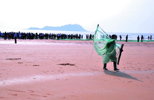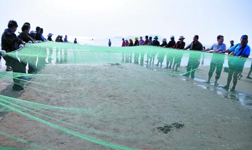 ????拉網捕魚作為青西新區(qū)沿海漁民傳統的生活方式,最早可追溯到戰(zhàn)國齊國時期,距今已有2000多年歷史。每年秋天,當地漁民都自發(fā)匯集在靈山灣畔,漁船在海里撒下1000多米長的漁網,在“把頭”的指揮下,漁民和游客自然分成相距100多米的兩隊,起錨后,一起喊著號子,齊心協力向岸上拉,每網能收獲幾千斤到上萬斤魚蝦,所得收獲參與者人人有份。