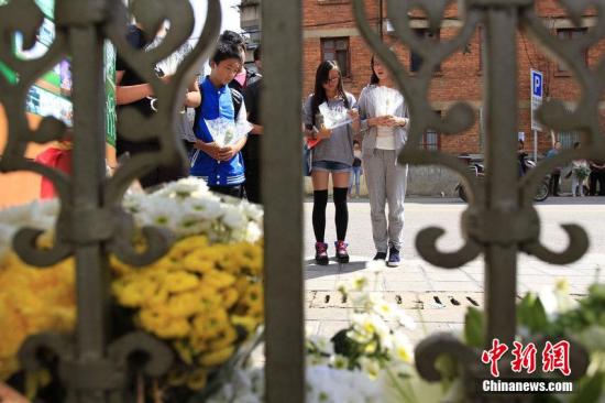 9月27日,昆明,有多位市民到明通小學校門外獻花、默哀,悼念逝去的生命。圖為明通小學門口往屆校友獻花默哀。圖片來源:CFP視覺中國