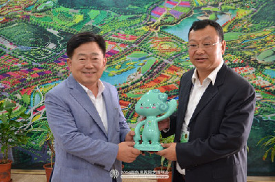 李奉利秘書長(zhǎng)向趙忠勛市長(zhǎng)贈(zèng)送世園吉祥物“青青”