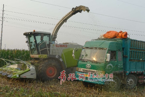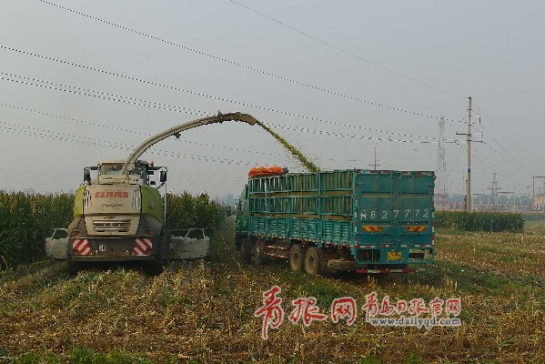 在西店子村種糧大戶王洪春的玉米田里,來自德國的克拉斯950玉米青貯機(jī)大顯身手。這臺(tái)600馬力的 “大力士”同時(shí)有著“大胃口”:僅前端的割臺(tái)就寬達(dá)6米,每小時(shí)最多可作業(yè)100畝,每天可青貯飼料 4000多噸。隨著機(jī)器的轟鳴,一壟壟玉米瞬間被收割、切碎,從一個(gè)類似“煙囪”的噴嘴中吐出的是大小 均勻的飼料。青貯機(jī)的主人、即墨市段泊嵐鎮(zhèn)農(nóng)機(jī)大戶劉本良介紹:“這臺(tái)機(jī)器青貯效果好、功能強(qiáng),具 有自動(dòng)裝機(jī)、自動(dòng)磨刀、自動(dòng)潤滑、金屬探測功能。舉個(gè)例子,如果刀頭前方出現(xiàn)鐵絲之類的,機(jī)器能夠 自動(dòng)監(jiān)測,并停止運(yùn)轉(zhuǎn)?!庇浾吡私獾?,這臺(tái)機(jī)具價(jià)格為280萬元。青貯機(jī)主要為牧場服務(wù),這幾天,劉本良的機(jī)器剛剛跨區(qū)作業(yè)回來。劉本良介紹,在東營2000米長的田地里,一天能完成青貯1000畝,一畝的費(fèi)用為150元,一天的收入就達(dá)15萬元。今年,劉本良僅靠一臺(tái)機(jī)器就已收入150萬。