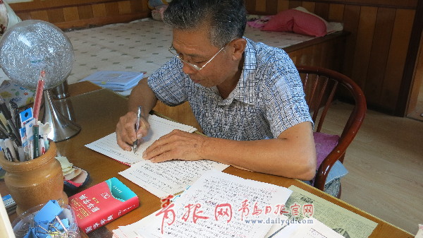 ????“一面朝海、三面環(huán)山,這個溫柔的懷抱,哺育著嶗山最淳秀的小漁村——青山,這是我的家鄉(xiāng),我一輩子不離開過的地方?!?65歲的劉振居戴著老花鏡,向記者念著自己剛寫好的手稿《我的家鄉(xiāng)——青山》。