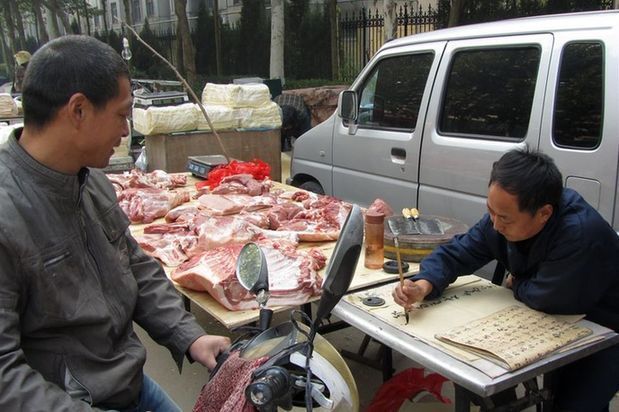 臨沂一豬肉鋪老板愛書法 攤前賣肉練字兩不誤
