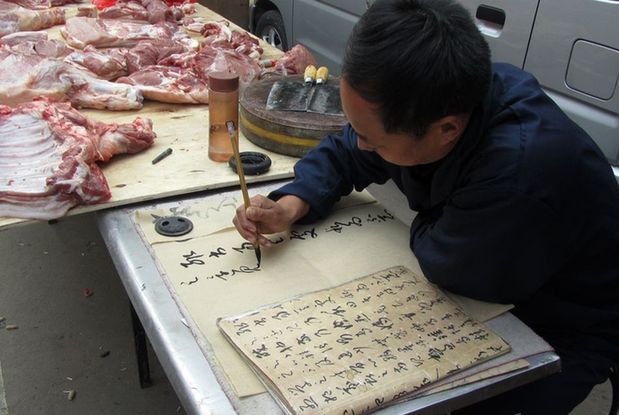 在山東臨沂市區(qū)一菜市場上,有一位與眾不同的肉鋪老板。平時別的老板都是忙著招呼顧客做生意,而他卻在空閑時就坐在攤前練書法。他叫范敬增,賣肉13年,一邊賣肉,一邊練書法。