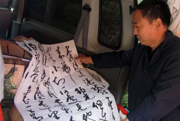 來范敬增這里買肉的人不少,來找他求字的人也不少。范敬增向記者展示他的書法作品。