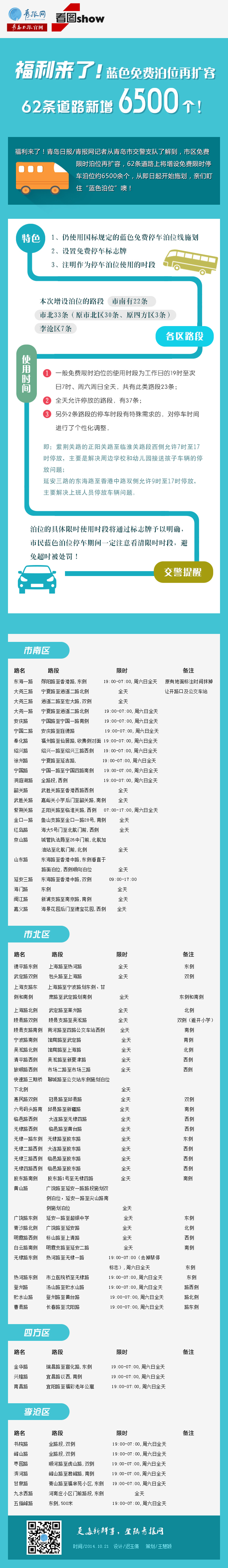 ????“國(guó)慶假期期間,我們?cè)谑袇^(qū)38條道路路段上設(shè)置了免費(fèi)限時(shí)停車泊位,取得了良好的社會(huì)和管理效果。在此基礎(chǔ)上,經(jīng)了解和聽取群眾意見并實(shí)地調(diào)研相關(guān)需求,繼續(xù)在市區(qū)62條道路路段上增設(shè)免費(fèi)限時(shí)停車泊位?!笔薪痪ш?duì)有關(guān)負(fù)責(zé)人介紹,增設(shè)的泊位仍使用國(guó)標(biāo)規(guī)定的藍(lán)色免費(fèi)停車泊位線施劃,同時(shí)設(shè)置免費(fèi)停車標(biāo)志牌,注明作為停車泊位使用的時(shí)段。本次增設(shè)泊位的路段市南有22條、市北33條(原市北區(qū)30條、原四方區(qū)3條)、李滄區(qū)7條。