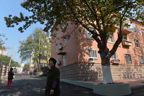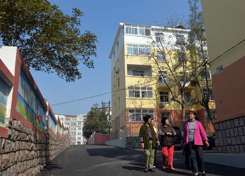 ????撫順路11號(hào)居民在整潔舒適的大院散步。(邢志峰 攝)