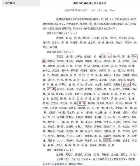 “為保證換發(fā)工作順利開展,防止出現(xiàn)新聞機(jī)構(gòu)填報(bào)虛假材料、不符合條件人員冒領(lǐng)記者證等問題,現(xiàn)將本臺(tái)將換領(lǐng)記者證人員名單公示如下”。今日,新京報(bào)記者登陸衡陽廣播電視臺(tái)官網(wǎng)發(fā)現(xiàn),10月20日,該網(wǎng)發(fā)布了《衡陽市廣播電視臺(tái)記者證公示》,公示期為10月18至10月26,上述6個(gè)名字都在名單中。
