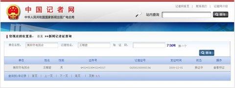 今日上午,新京報(bào)記者登陸中國記者網(wǎng)查詢發(fā)現(xiàn),陳放、鄧秋林、曠杰、王小山、王酈君均在2009年12月1日起持有記者證,蔣紅持證比上述5人晚幾個(gè)月,領(lǐng)證日期為2010年3月3日。目前,6人均處于“換證中”狀態(tài)。