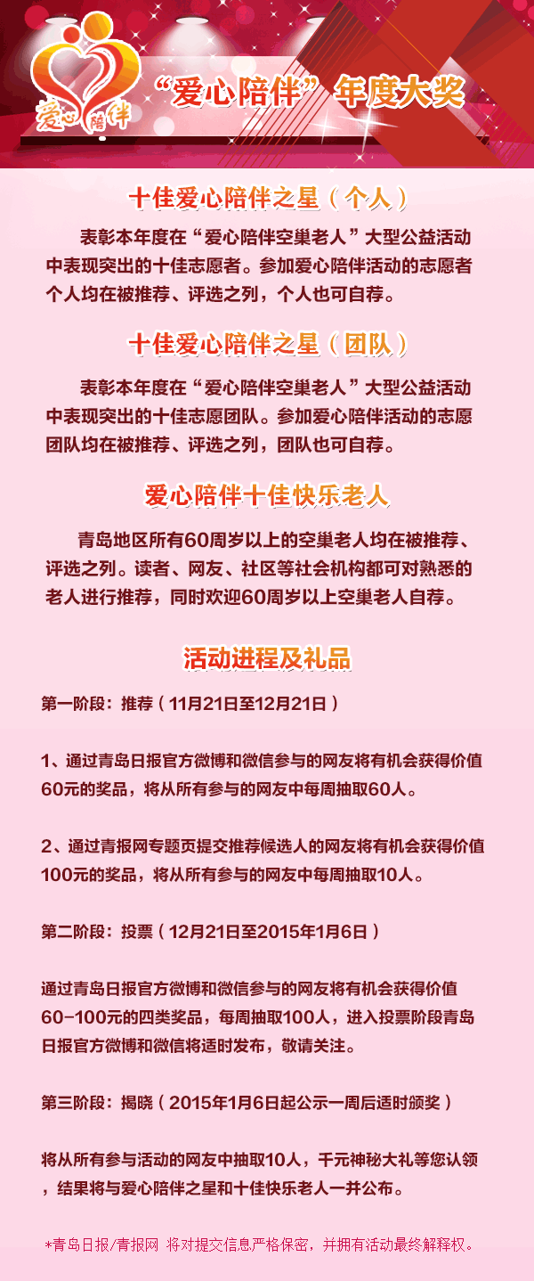 ????青島日報/青報網(wǎng)訊 繼去年成功舉辦“愛心陪伴空巢老人”年度大型公益頒獎盛典之后,今年,本著既節(jié)儉又隆重的原則,青島日報/青報網(wǎng)、市老齡辦改革評選方式,自今日起,正式啟動2014年度“愛心陪伴”大型在線推薦、評選及網(wǎng)上頒獎盛典活動。誰將成為2014年度十佳“愛心陪伴之星”(個人)?哪個團(tuán)隊將獲得十佳“愛心陪伴之星”(團(tuán)隊)?誰又是您眼中生活最快樂的空巢老人(評選十位)?歡迎社會各界和志愿者團(tuán)隊積極參與,請推薦您心中的三個“十佳”,請您投下熱誠而關(guān)鍵的一票。本次大型推薦評選活動由青島交運(yùn)集團(tuán)鼎力支持,青島著名影星黃曉明所屬“明天愛心基金會”也熱誠參與。