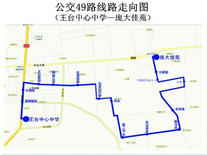 ??? 真情巴士公交49路由王臺中心中學(xué)發(fā)往龐大佳苑,設(shè)站16處,全程12公里,實行無人售票,票價1元。王臺中心中學(xué)首末車時間為6:30、19:00;龐大佳苑為6:00、18:30。
