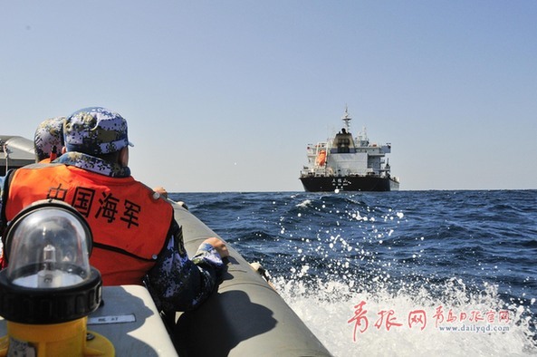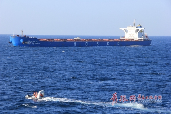 搭載醫(yī)療隊員的微山湖艦艦載小艇駛向商船