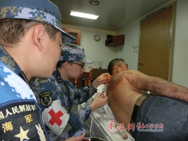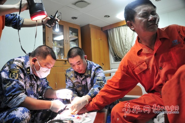 ????10時20分,正在微山湖艦醫(yī)療人員乘小艇返回途中,濰坊艦接到了來自被護商船“五桂山”號的醫(yī)療支援請求。他們立即派出由7人組成的醫(yī)療小組,頂著2米多高涌浪,乘小艇登上“五桂山”號商船。船員陳順輝不僅右手食指第二關(guān)節(jié)斷裂,而且左臉嚴重劃傷,血流不止。軍醫(yī)李祥文和隨行的第二軍醫(yī)大學骨科專家付奇?zhèn)チ⒓磳谶M行清創(chuàng)消毒和修復縫合,使傷口得到了有效處置,為進一步的治療贏得了寶貴時間。