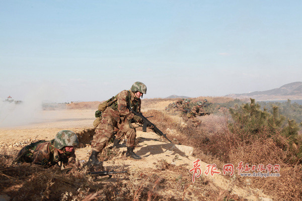 青島警備區(qū)冬季野營訓(xùn)練現(xiàn)場 圖為戰(zhàn)士在沖鋒