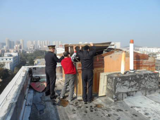 接到居民舉報,在邢臺路社區(qū)71號處有人在高層上私搭亂建,李滄城管執(zhí)法局興華路中隊執(zhí)法人員立即到現(xiàn)場了解情況。到達(dá)現(xiàn)場后發(fā)現(xiàn),違建房是用廢棄木頭簡易搭建的小房,約有4平方米,木板與木板間的銜接不牢固,里面堆滿了雜物,存在安全隱患。經(jīng)執(zhí)法人員現(xiàn)場核實,該違章戶是在沒有任何相關(guān)手續(xù)的情況下,擅自進(jìn)行違章搭建的。根據(jù)相關(guān)規(guī)定,興華路中隊執(zhí)法人員對當(dāng)事人進(jìn)行了說服教育,當(dāng)事人在認(rèn)識到錯誤后和城管執(zhí)法人員一起將違章建筑拆除了,恢復(fù)了樓棟的原狀。