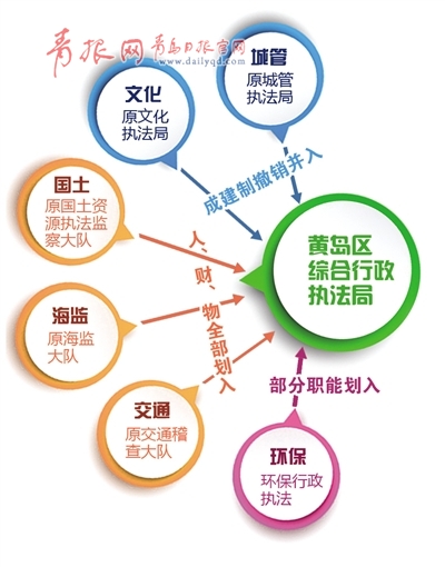 ????記者在采訪中了解到,針對以往多頭執(zhí)法中存在的權責交叉、推諉扯皮等問題,近日,黃島區(qū)將原城管執(zhí)法局、文化執(zhí)法局成建制撤銷,并入新成立的綜合行政執(zhí)法局;原交通稽查大隊、國土資源執(zhí)法監(jiān)察大隊、海監(jiān)大隊的人、財、物全部劃入綜合行政執(zhí)法局;環(huán)境保護領域的部分行政執(zhí)法職能劃入綜合行政執(zhí)法局。
