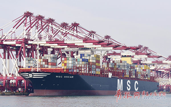 ????青島日報/青報網(wǎng)訊1月28日,全球最大、最先進、最大載箱量19224TEU的“地中海奧斯卡”輪靠泊青島港QQCT碼頭。該輪是今年1月份地中海航運公司下水的新船,船長395.4米,型寬59米,吃水—16米,載箱量19224TEU、載重噸為197362噸,打破了2014年12月4日靠泊青島港的“中海環(huán)球”輪創(chuàng)造的1.91萬TEU載箱量的紀錄。