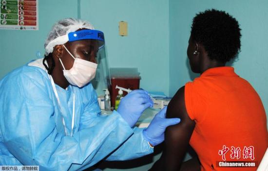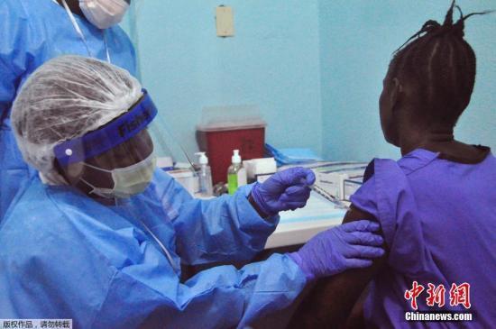 當(dāng)?shù)貢r間2015年2月2日,利比里亞蒙羅維亞,醫(yī)護(hù)人員為民眾注射埃博拉疫苗。