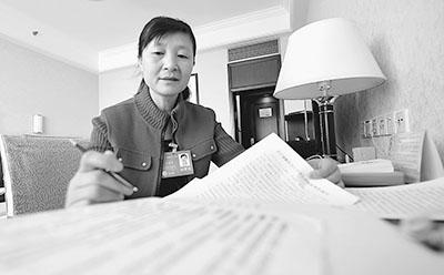 2014年全國兩會期間,江蘇淮安環(huán)衛(wèi)工孫國慶代表正在整理建議案。李 舸攝