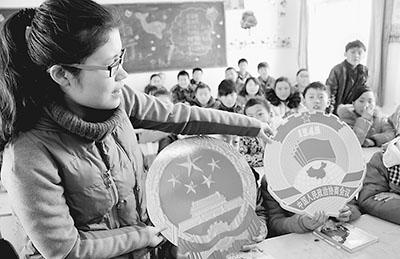 2014年3月6日,河南省內(nèi)黃縣第四實驗小學老師在給孩子們講解兩會會徽。 劉肖坤攝