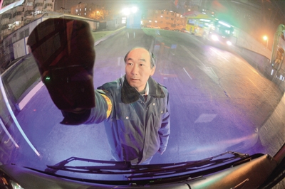 ????夜幕下,在南豐路公交停車場,130多輛公交車整齊地停放著,只有一輛公交車亮著燈,“224路夜公交”的字樣在夜色中格外醒目。老姜擦拭完車前的風(fēng)擋玻璃后,發(fā)動起車輛,“車上有暖風(fēng),早點熱熱車,增加車里的溫度。”老姜笑呵呵地說。