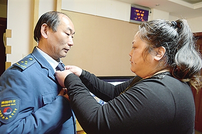 上班之前,妻子仔細為他整理工裝。