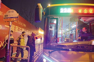 ????晚上十點半,當(dāng)天的第一班夜公交準時發(fā)出,線路和白天的224路車完全一致,從南豐路到眼科醫(yī)院環(huán)行,全程21.5公里,共33站。在第一站南豐路站,就上來三名乘客。其中一位是在附近一家酒店工作的廚師,和老姜都是熟人了。一圈下來,記者統(tǒng)計了一下,有40多位乘客,其中代駕司機最多,眼科醫(yī)院的工作人員也是主要客源,在南部工作,北部居住的年輕人也不少?!安簧偃宋覀兺κ欤宪嚩即騻€招呼問聲好?!崩辖f。